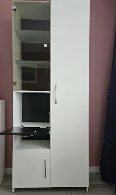 Szafa z dwiema półkami za szkłem oraz pólkami z drzwiami w której można przechowywać różne przedmioty. Produkt ...